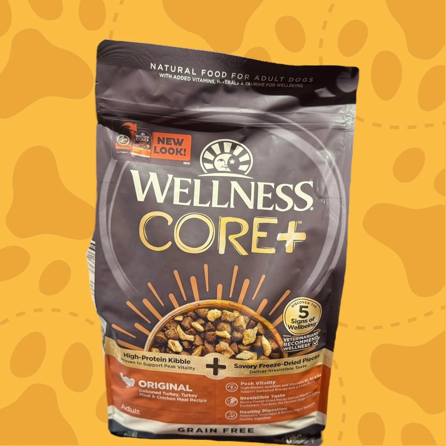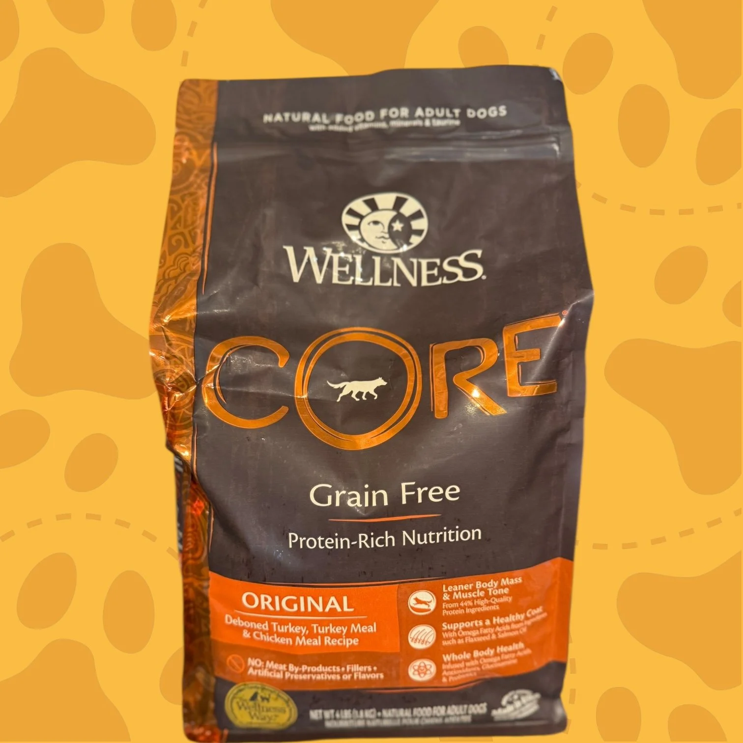 Wellness CORE Natural Grain Free Dry Dog Food Original Turkey & Chicken Recipe is healthy, 100% natural grain free dog food for adult dogs made with turkey, chicken, salmon oil and fruits and vegetables to help support your dog's optimal health and fortified with antioxidents, probiotics, vitamins and minerals, including fish and flax omega blend for healthy skin and coat. Wellness CORE grain free dog food formulas are based on the nutritional philosophy that dogs thrive on a diet mainly comprised of meat. Each grain free, nutrient-rich formula provides high quality protein for your dog with no meat by-products or fillers, grain, corn, soy, wheat-gluten or artificial preservatives, colors or flavors.
